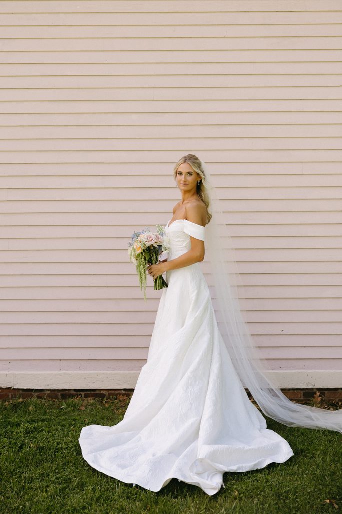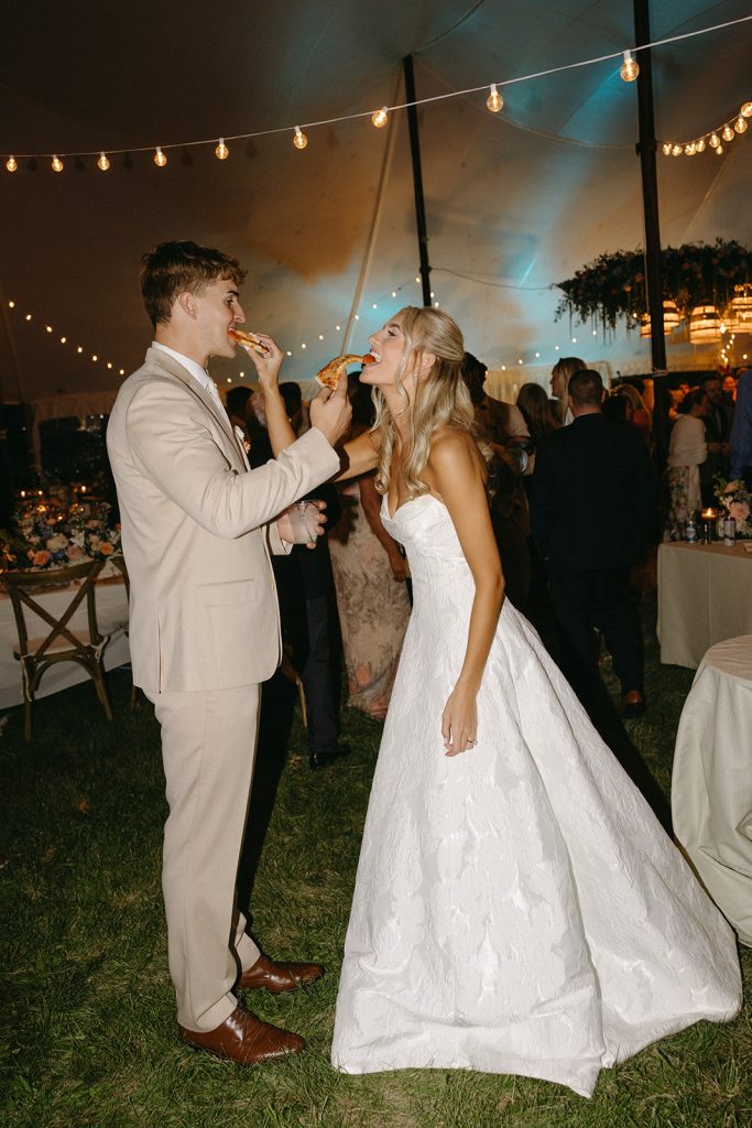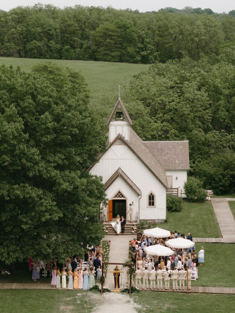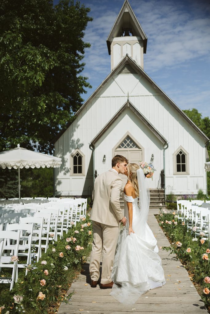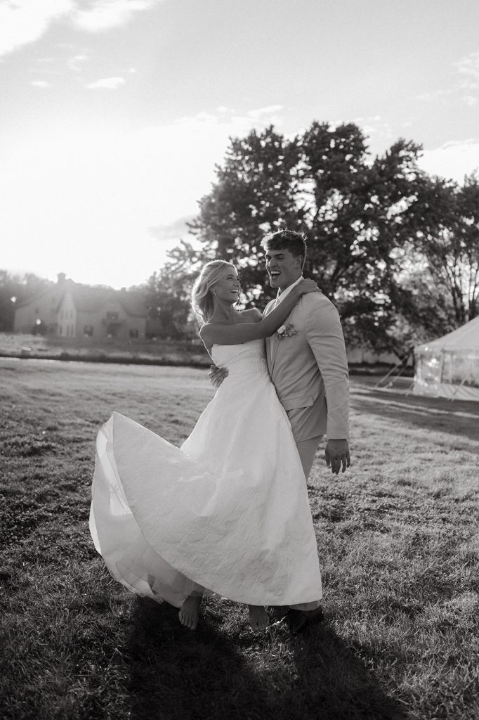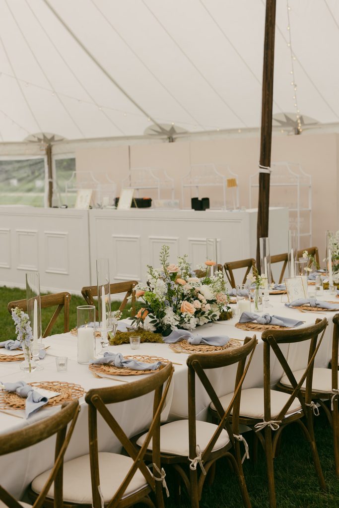 “I can’t even begin to put how much our wedding meant to us in words. We got married outside of the chapel Eli and I grew up going to, (and ran in to the church to ring the wedding bells after)! Our guests headed to the outdoor cocktail hour where we had outdoor bars, games, and signature drinks. We then all walked into the Milestone Event Rental tent and admired the beautiful work done by White Willow Events. It was truly the most perfect day, surrounded by friends and family!” -The Bride