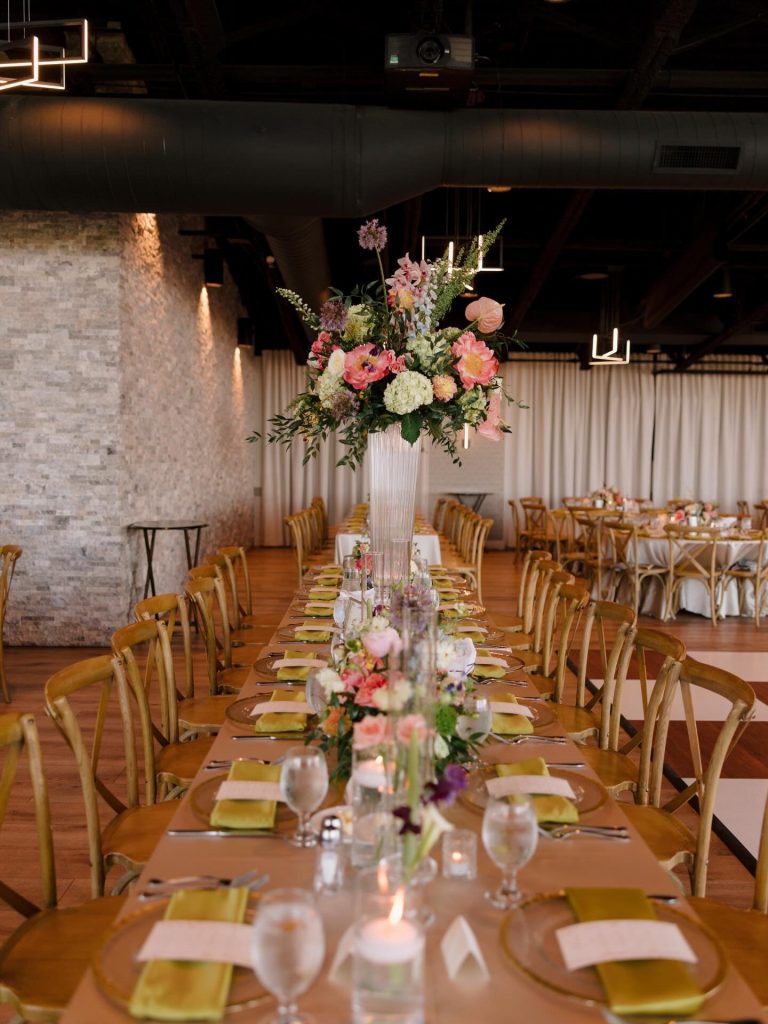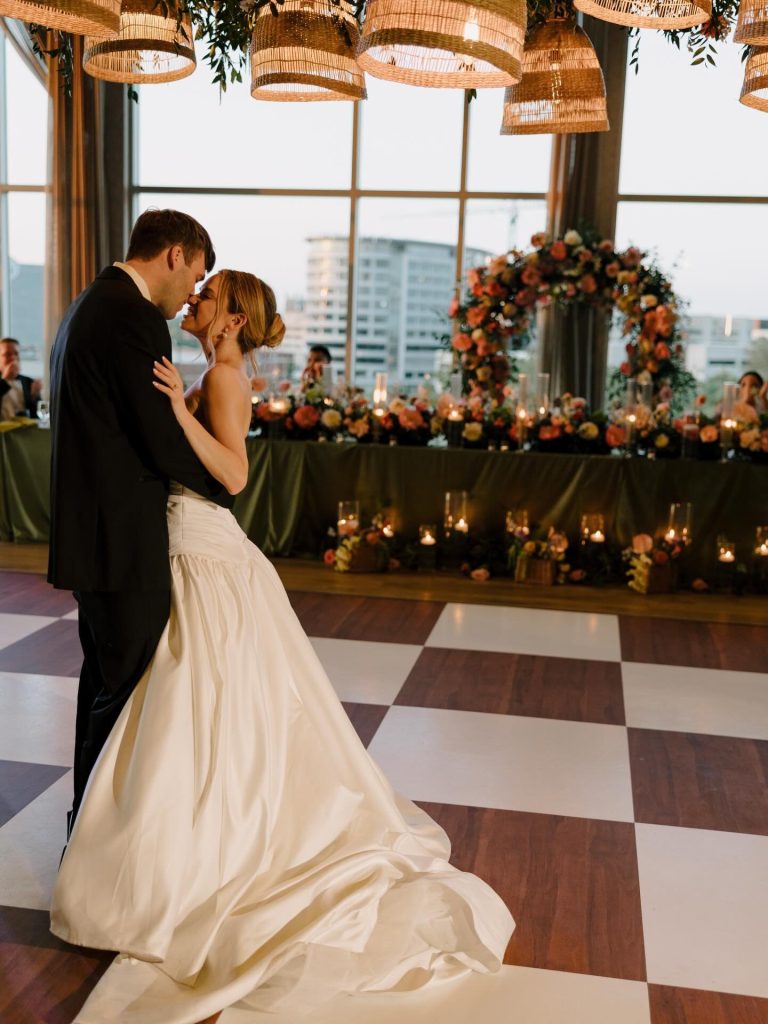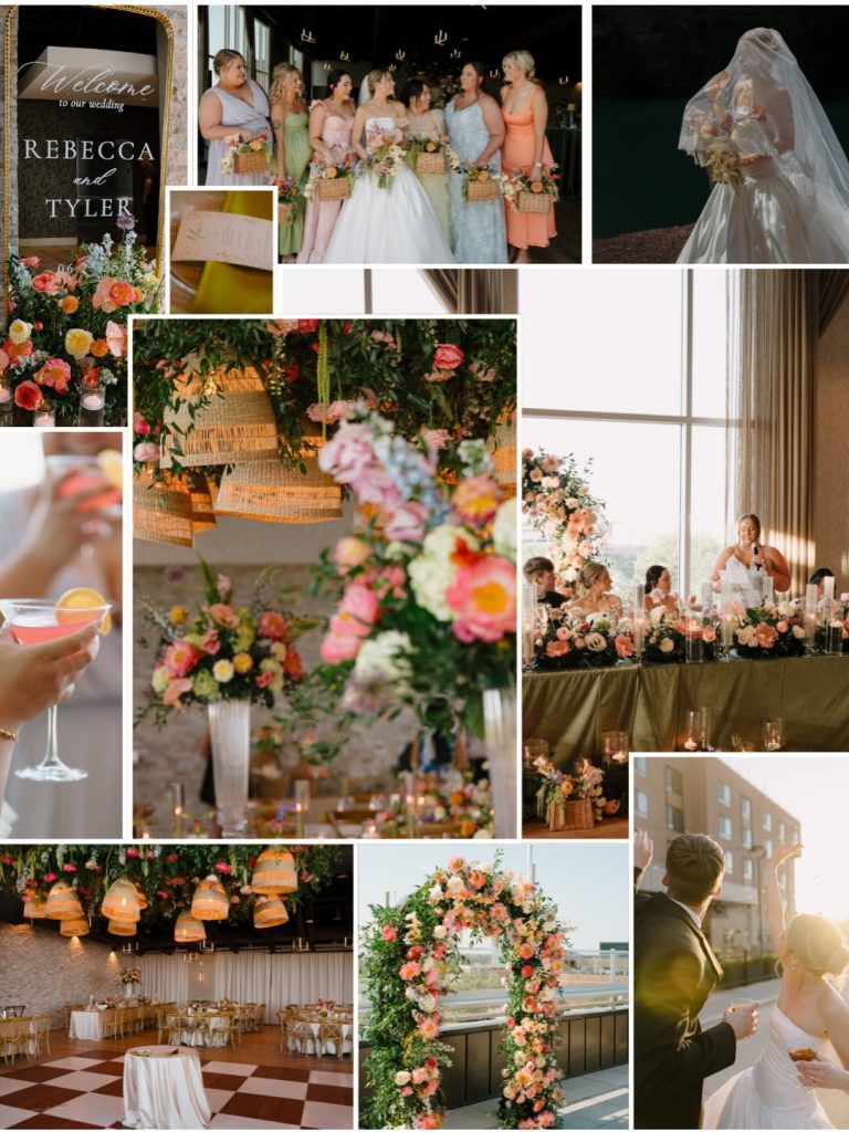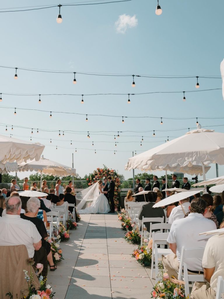 Becca and Tyler celebrated at The Heights Rooftop, where sweeping rooftop views and an open-air ceremony created the perfect setting for a day full of joy, color, and meaningful details. From the very start, the celebration felt elevated yet effortlessly personal. Their outdoor ceremony space was beautifully transformed by White Willow Events, whose expert planning, floral design, and decor brought the couple’s vision to life in a colorful way. Every floral, table setting, and detail added to the vibrant energy that carried throughout the day. Becca was radiant in her bridal gown from Rosalie Bridal, while Tyler looked timeless and polished in his attire from Skeffingtons Formal Wear.