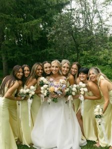 Lexie + Jake’s wedding day was nothing short of magical, and every detail was flawlessly captured by the incredibly talented, Aaryn Mae Exposures. From the joyful laughter shared among friends and family to the heartfelt tears that flowed during the emotional moments, no aspect of the day was overlooked. The deep, forest green bridesmaids’ dresses beautifully complemented the open landscape surrounding the venue. Following the heartfelt ceremony, the wedding party celebrated with some fun games before the reception! The couple also had giant cutouts of their heads that joined everyone for the dance party – scroll down to see!