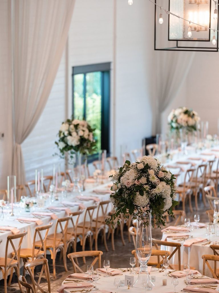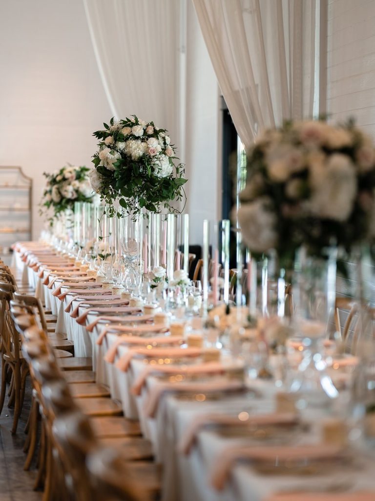 Long elegant reception table with tall white floral centerpieces and modern black chairs in windowed venue