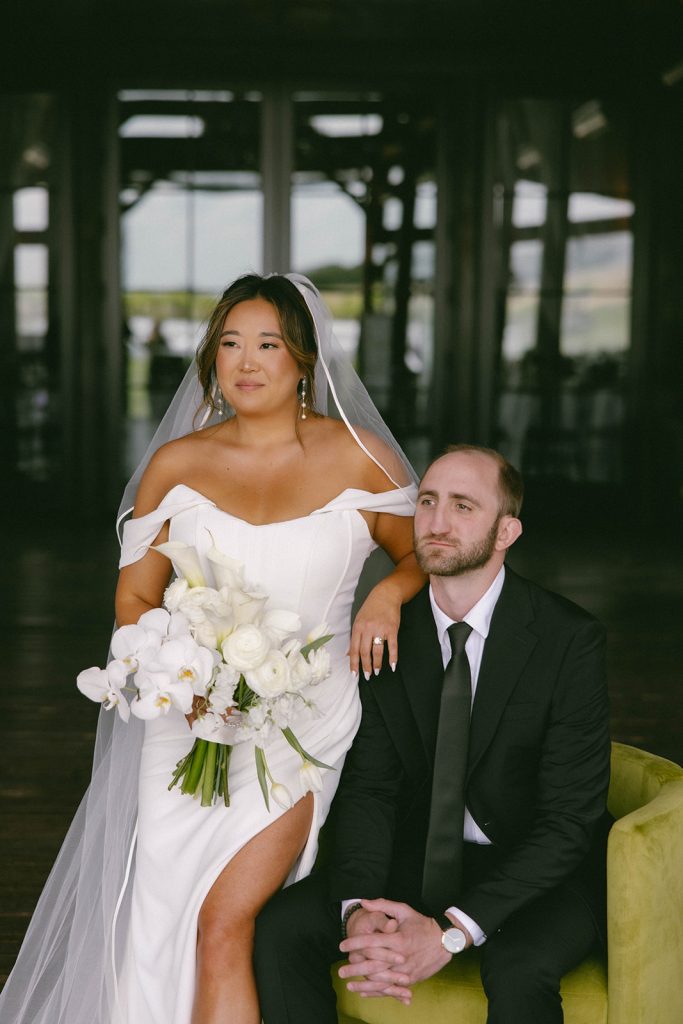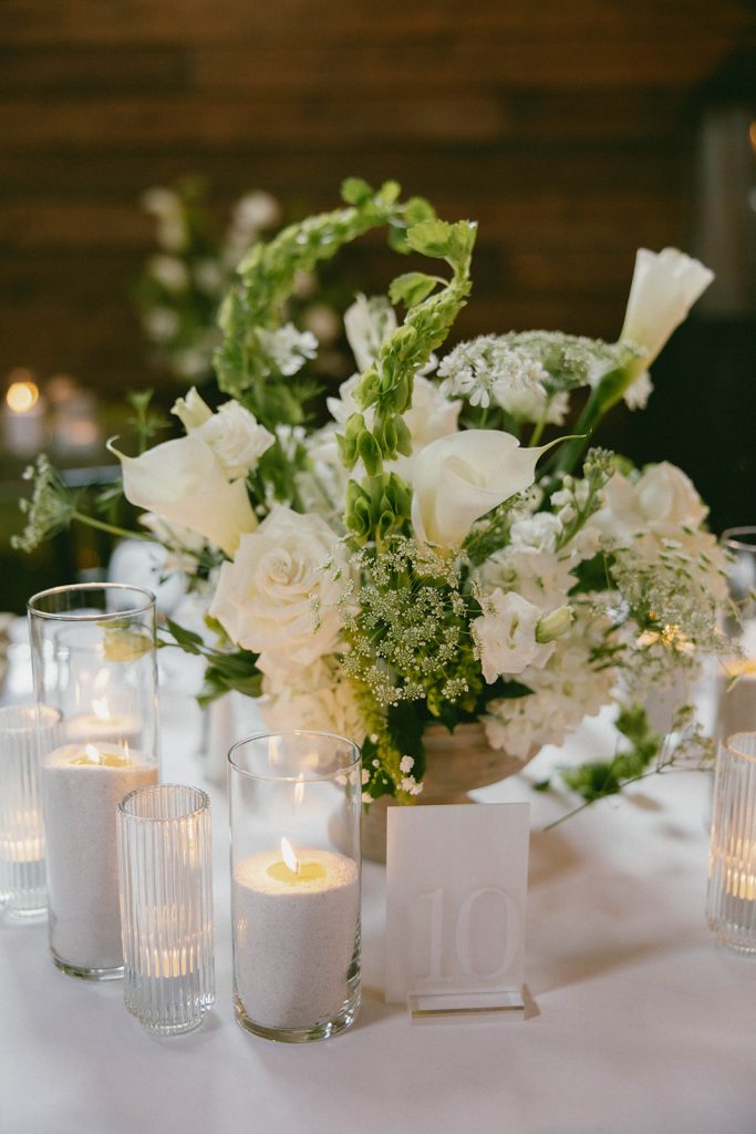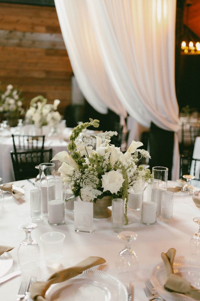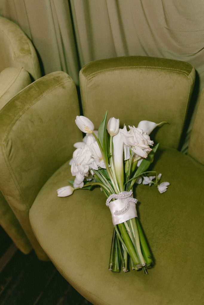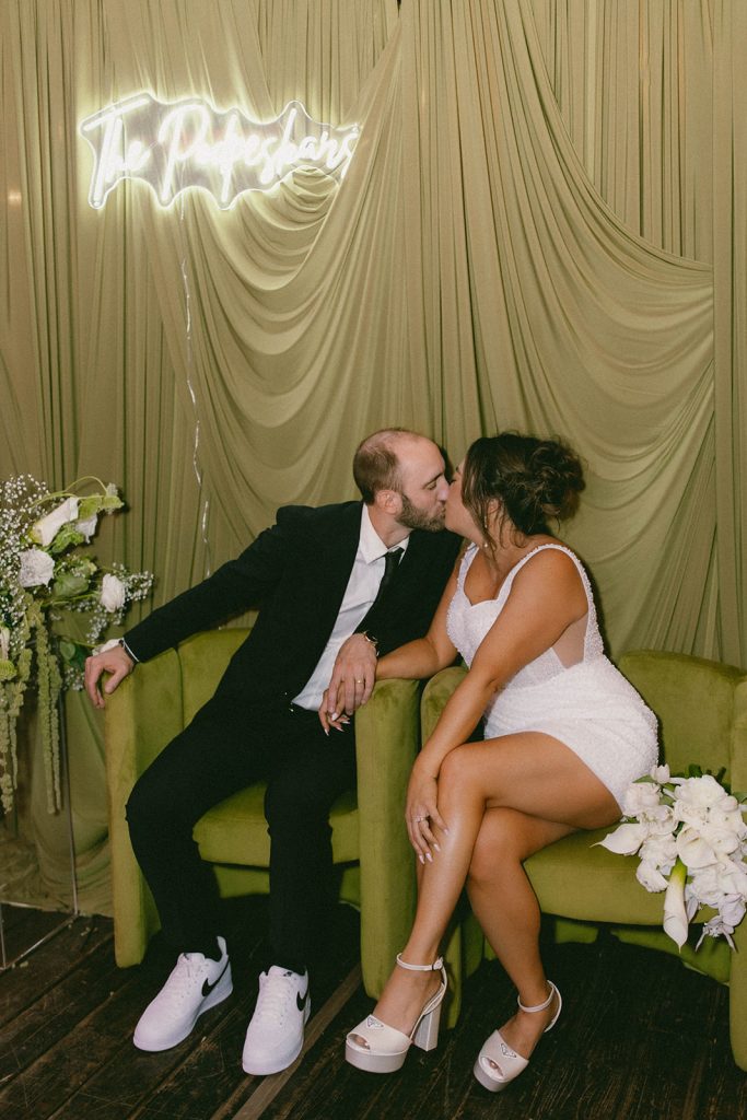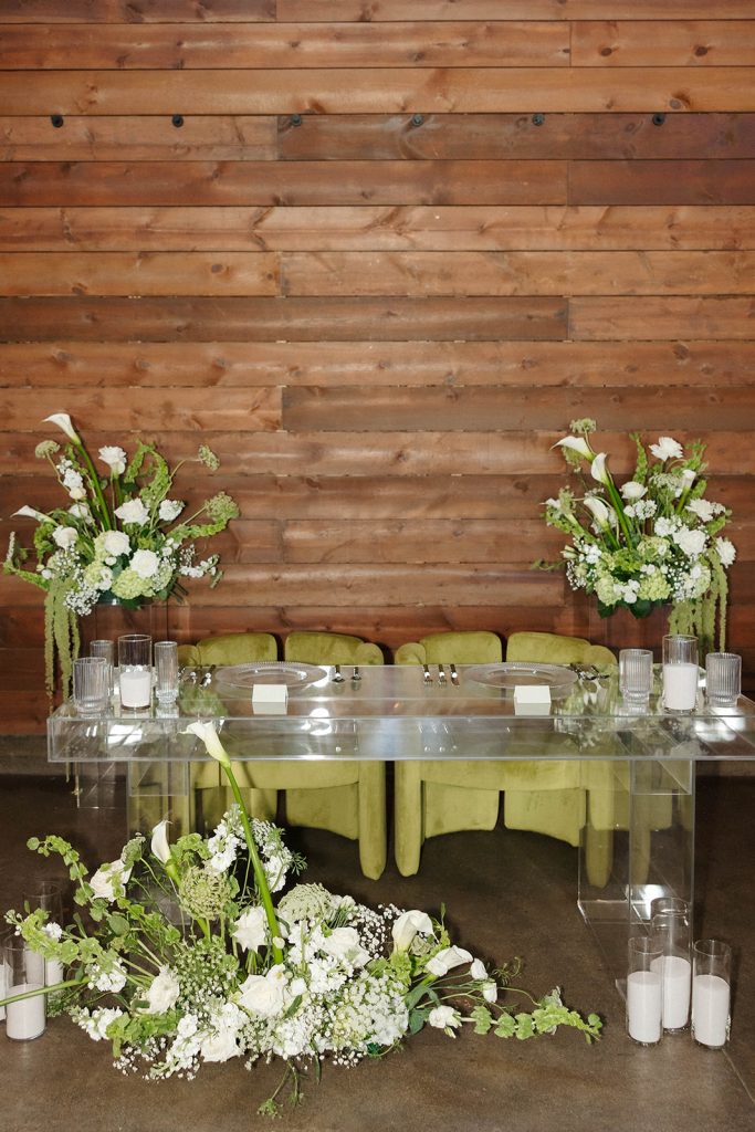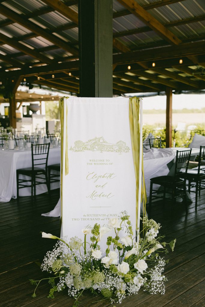 Elizabeth and Michael’s wedding day was a beautifully orchestrated affair, where meticulous planning and personal details came together seamlessly. The couple kept their color palette and style a delightful surprise for family and friends, heightening the excitement and joy of the festivities. Every detail of the reception was carefully planned by White Willow Events, showcasing striking pops of green, which Elizabeth was absolutely obsessed with. Collaborating with Carly from Monarch Events, Elizabeth selected décor that perfectly matched her vision, including chartreuse green velvet chairs and beautiful matching drapery for a photo backdrop. The custom acrylic sweetheart table and vintage mirror seating chart from Monarch Events added a touch of elegance to the celebration. The lush green velvet chairs and elegant draping, also from Monarch Events, created a captivating atmosphere throughout the celebration. The exquisite floral arrangements by White Willow Events added an enchanting touch, with breathtaking blooms that adorned the arbor and sweetheart table.