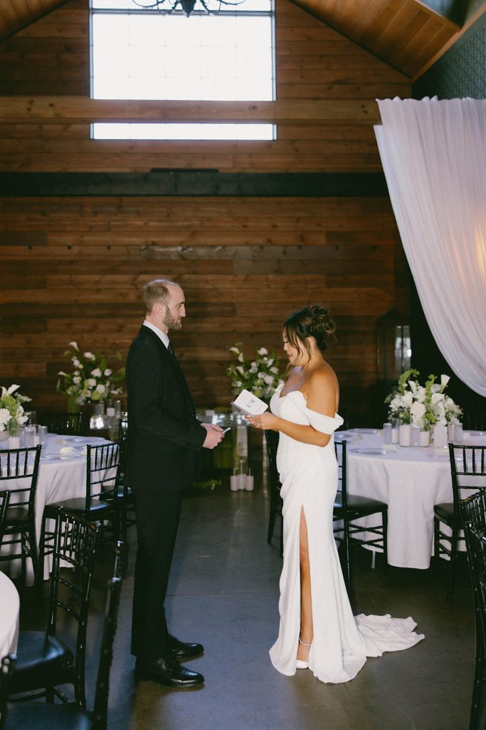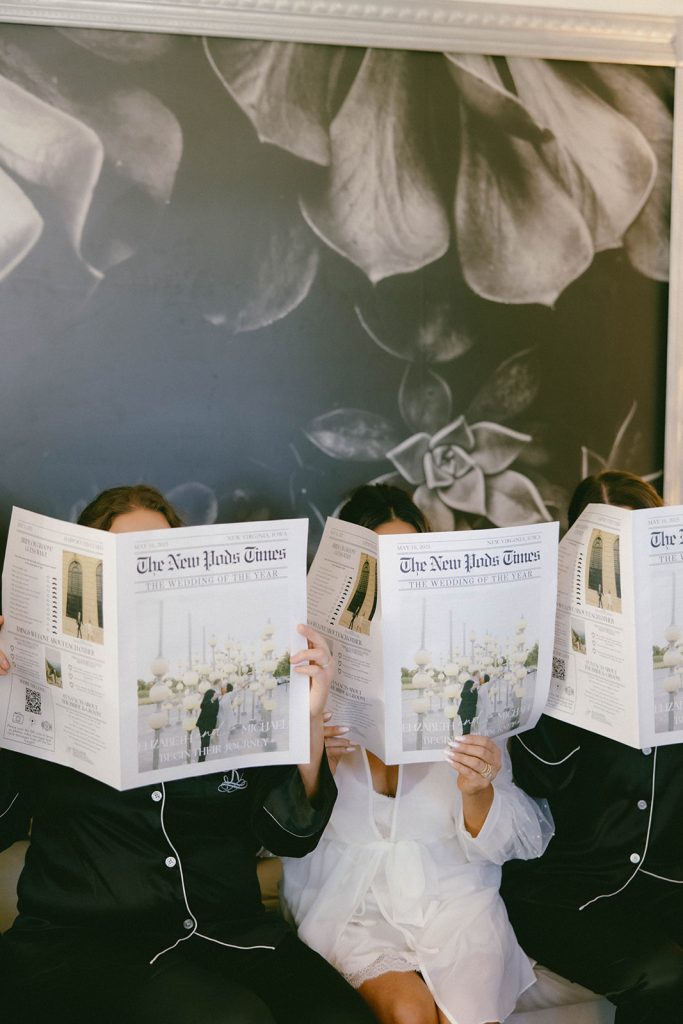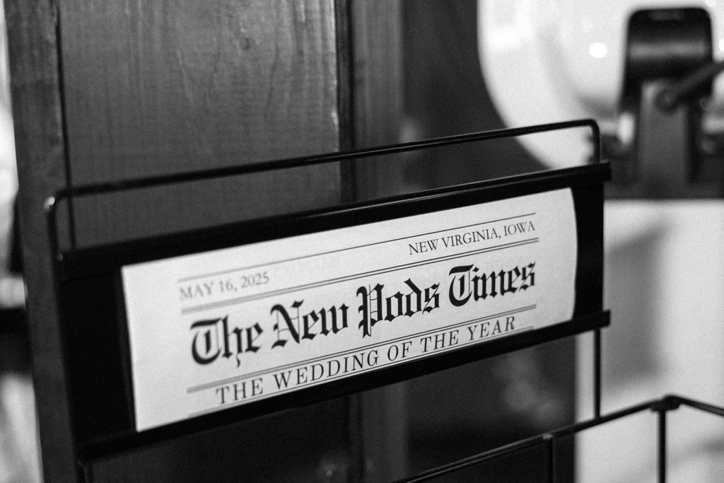Thoughtful touches throughout the day included beads from Elizabeth’s mom’s veil incorporated into her bouquet, a vintage wedding gown from her grandmother repurposed as her night-before outfit, and hand-embroidered initials on Michael’s dress shirt, ensuring he had her heart literally on his sleeve. The newspaper programs served as a fun and unique element that guests enjoyed, while cocktail napkins featured handwritten love notes that personalized the experience.