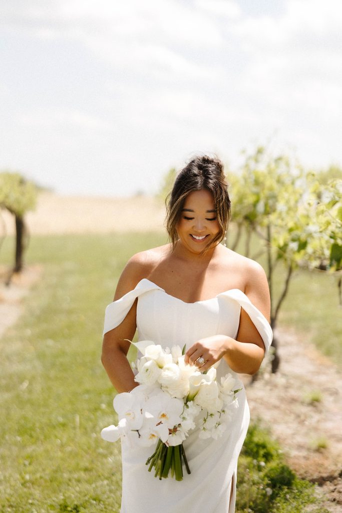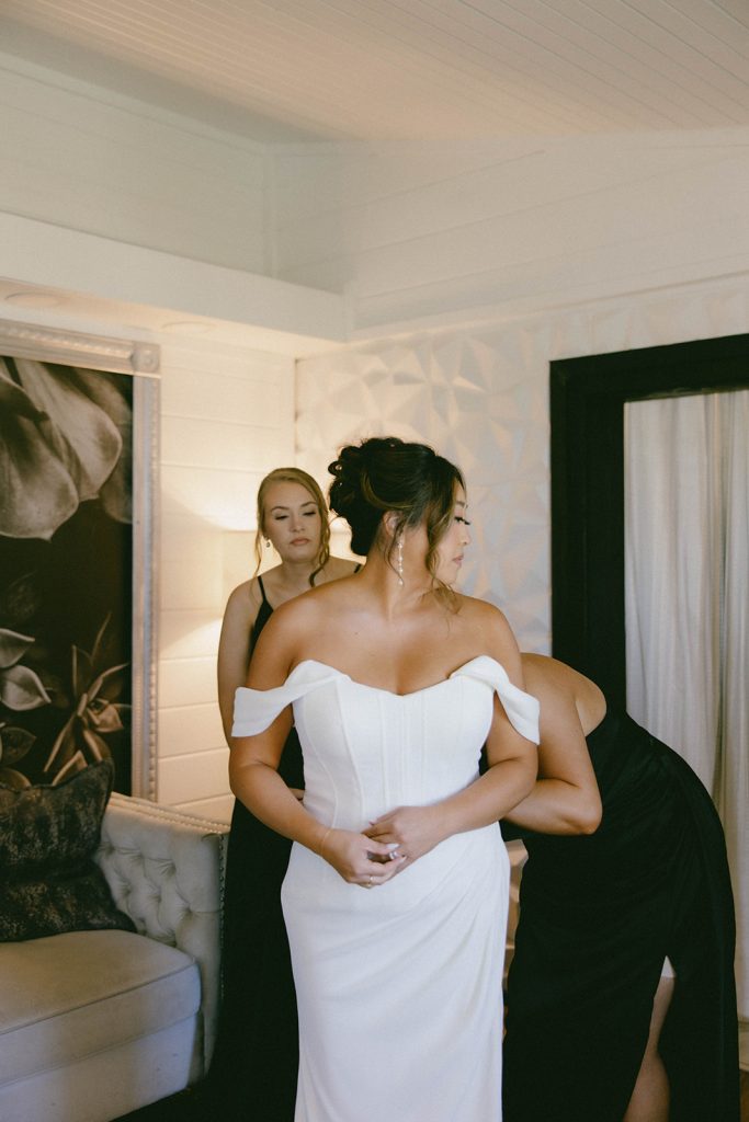 First, a moment for the dress! Modern Dress Bridal Boutique played a pivotal role in helping Elizabeth select a gown that truly complemented her individual style. Their expert team guided her through a tailored selection process, ensuring the choice of a dress that not only fitted perfectly but also perfectly captured her vision. Along the back, a row of delicate buttons adds a classic detail, complementing the gown’s clean silhouette. The dress perfectly highlighted Elizabeth’s natural grace making her wedding day exceptionally memorable. Elizabeth and her entire bridal party were also all glowing thanks to our friends at Tanique. They had a bridal glow party and it was one of Elizabeth’s favorite things leading up to the day!