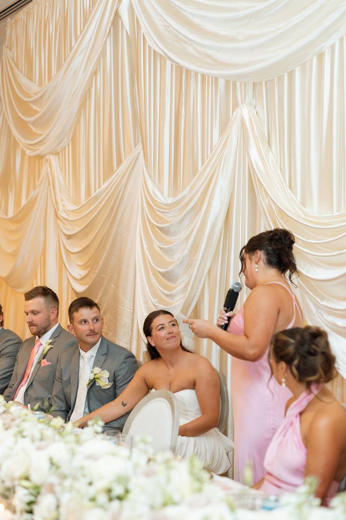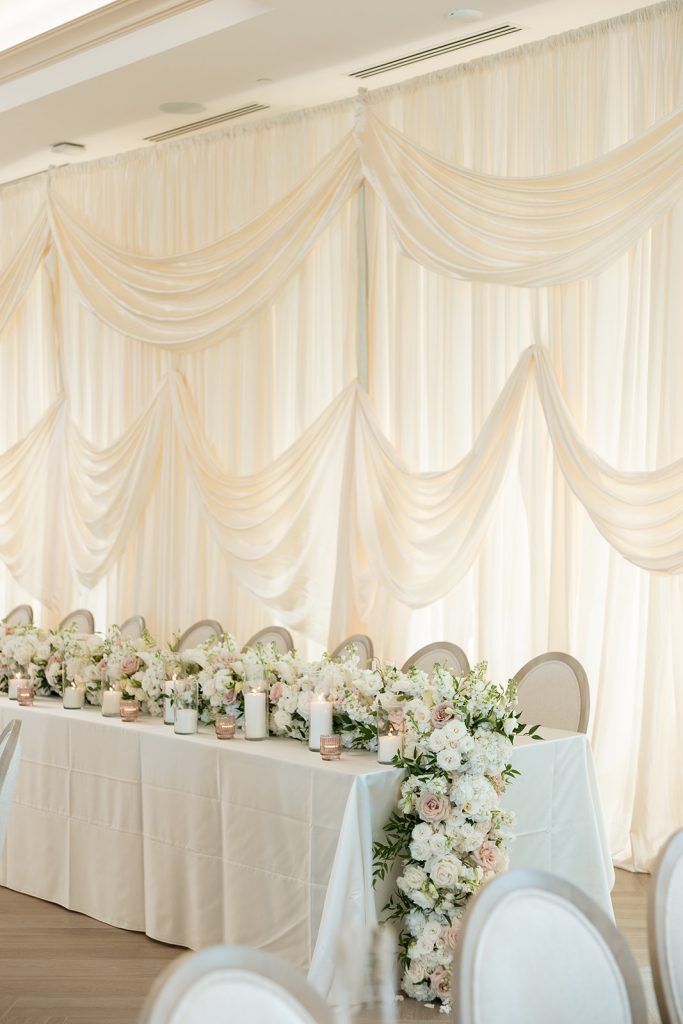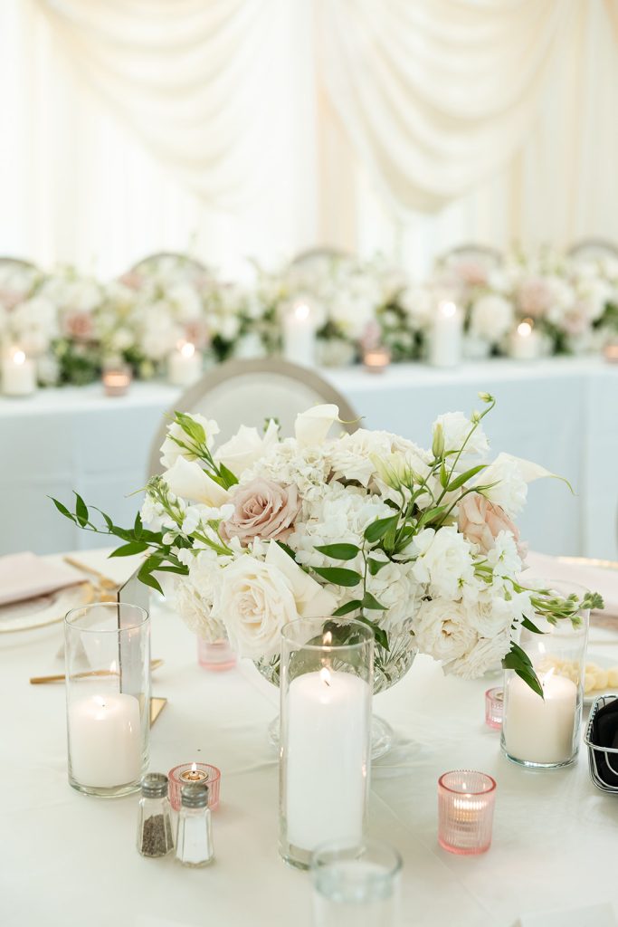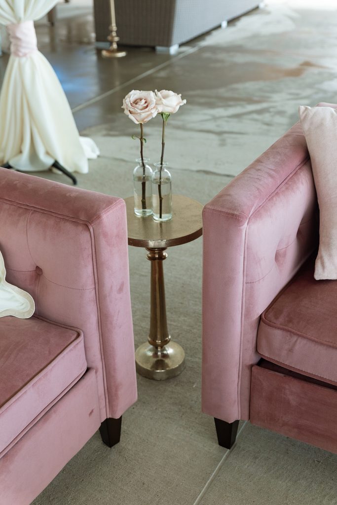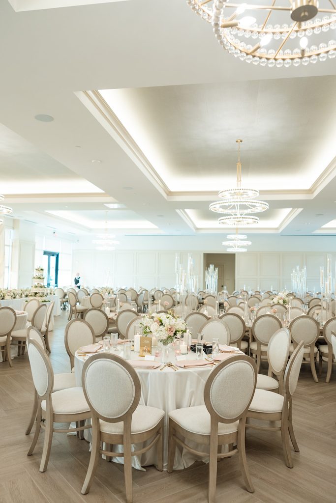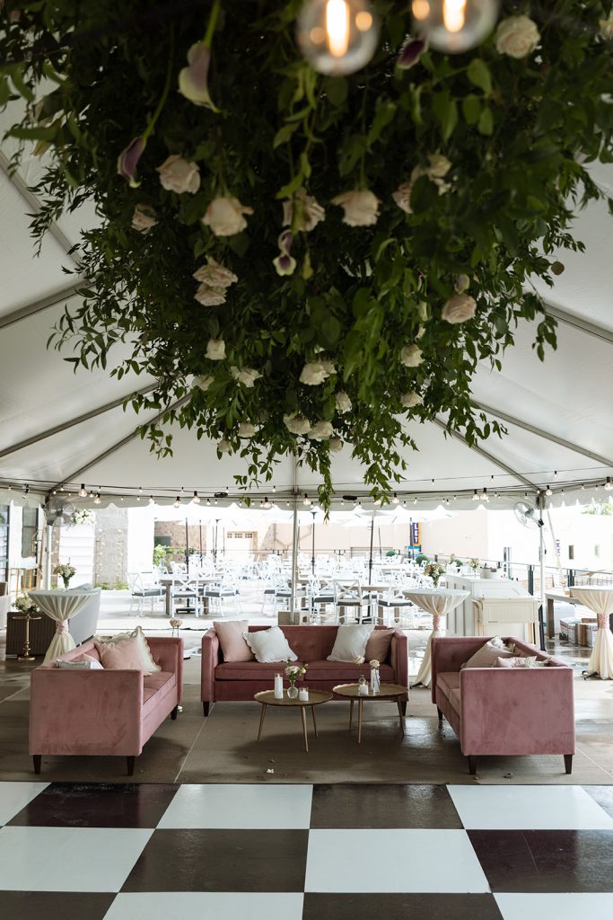 Sydney & Noah utilized the many different versatile spaces at The Clubhouse, with the ceremony taking place underneath the pavilion near the course, cocktail hour near the bar, dinner in the Grand Ballroom, & finally, the dance party on the terrace. “The sunset lit up the course in the most perfect way, and then the night turned into such a fun celebration. We danced, laughed, and soaked in every single moment with our closest friends and family.”said Sydney. River Center Catering served a memorable menu which included savory passed appetizers (included steak bites & caprese sticks) during cocktail hour, followed by a perfect plated dinner. Chase, owner of JM3 DJs & Productions, kept the dance floor moving with high energy all night long, beneath the tented terrace, while disco balls sparkled overhead. It was no surprise that everyone was dancing and laughing the whole night! White Willow Events also executed the decor and planning, bringing Sydney’s soft light pink vision to life with elegant table settings and floral touches. Velvet pink couches framed the checkered dance floor on the terrace, while cascading florals filled the grand ballroom and silk drapery set the scene behind the head table.