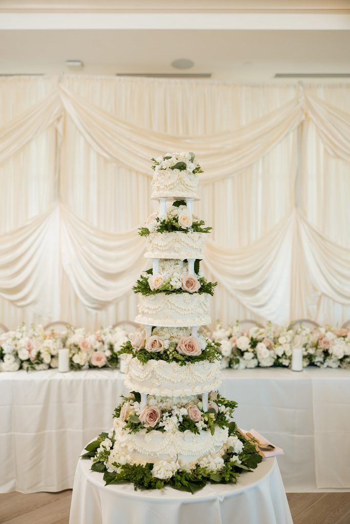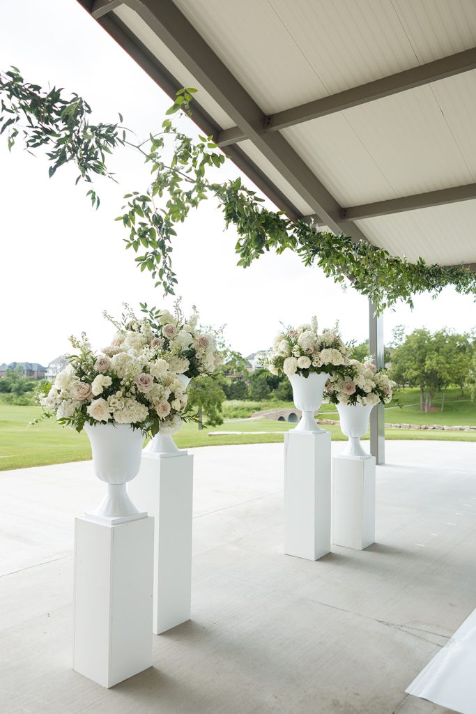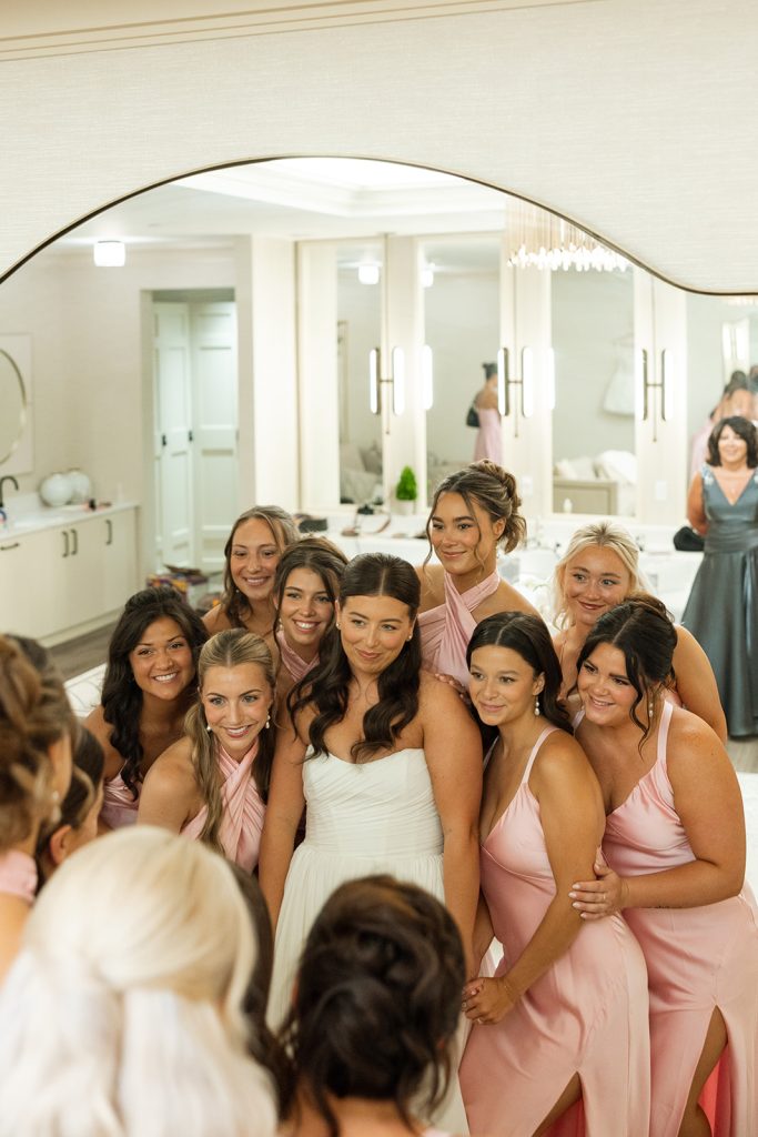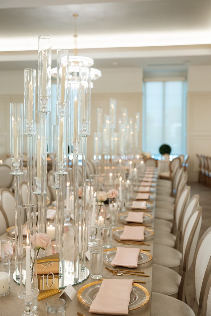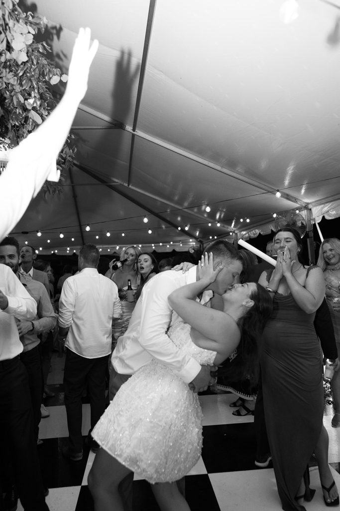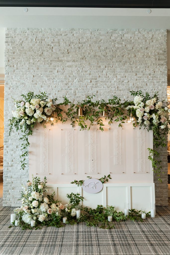 Sydney & Noah utilized the many different versatile spaces at The Clubhouse, with the ceremony taking place underneath the pavilion near the course, cocktail hour near the bar, dinner in the Grand Ballroom, & finally, the dance party on the terrace. “The sunset lit up the course in the most perfect way, and then the night turned into such a fun celebration. We danced, laughed, and soaked in every single moment with our closest friends and family.”said Sydney. River Center Catering served a memorable menu which included savory passed appetizers (included steak bites & caprese sticks) during cocktail hour, followed by a perfect plated dinner. Chase, owner of JM3 DJs & Productions, kept the dance floor moving with high energy all night long, beneath the tented terrace, while disco balls sparkled overhead. It was no surprise that everyone was dancing and laughing the whole night! White Willow Events also executed the decor and planning, bringing Sydney’s soft light pink vision to life with elegant table settings and floral touches. Velvet pink couches framed the checkered dance floor on the terrace, while cascading florals filled the grand ballroom and silk drapery set the scene behind the head table.