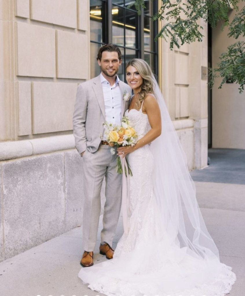 Newlyweds walk hand-in-hand across a grassy Iowa field, bride in flowing gown with veil and groom in tan suit